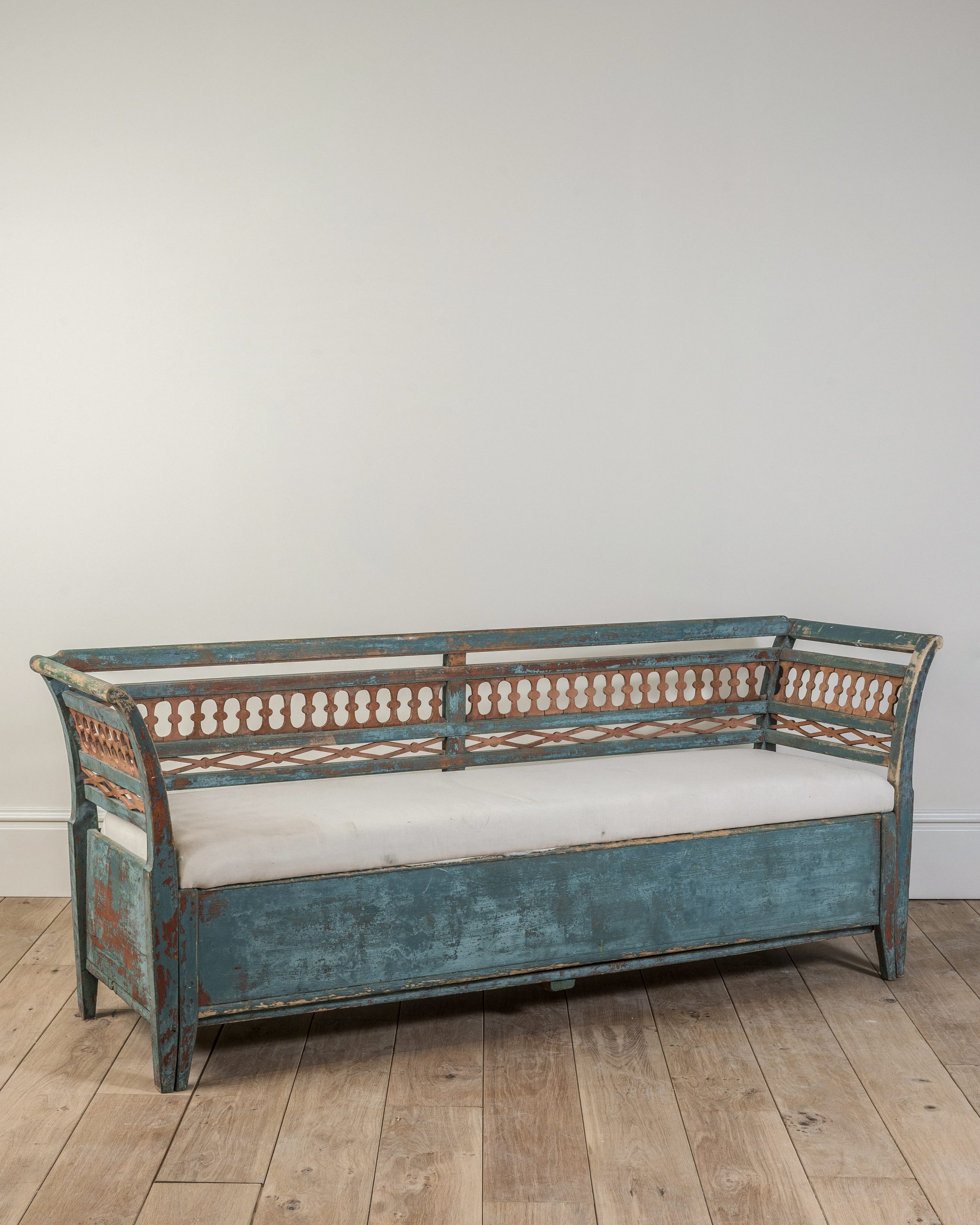 Banco sueco del siglo XIX pintado en azul y rojo y con pátina. El asiento se ha dejado en tela blanca de retor, pudiendo dejarlo así o retapizarlo según el ambiente en el que vaya a ir.