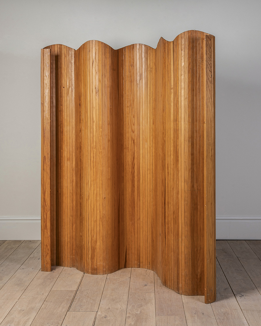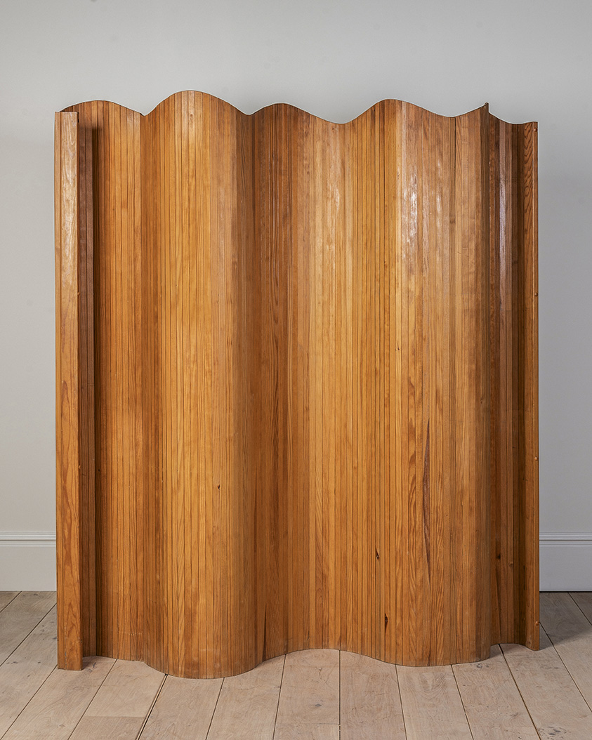 Biombo de listones de madera (pino) estilo Jomain Baumann, Francia, en las décadas de 1930/50. La pantalla está articulada por un sistema de listones de madera y alambre metálico invisible, lo que le da la forma de una onda. La pantalla se pliega sobre sí misma, lo que facilita su transporte y almacenamiento.