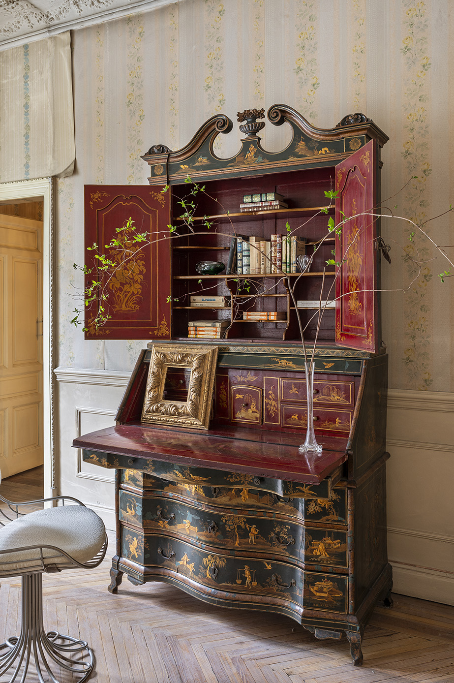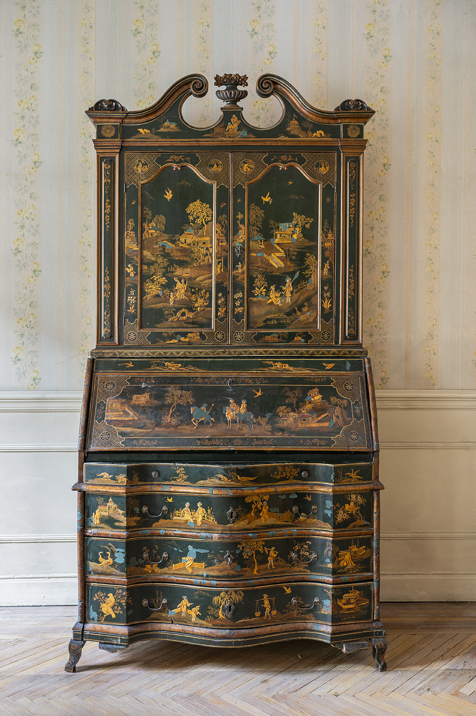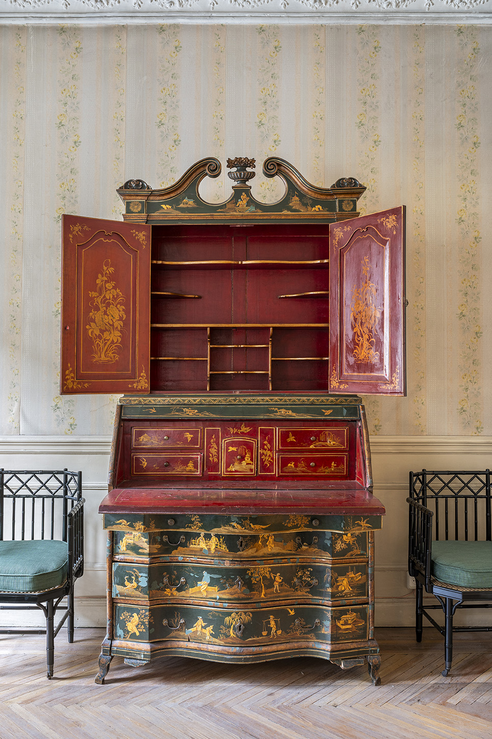 Mueble escritorio estilo chinoiserie del siglo XVIII lacado con incrustaciones pintadas. Sus detallados grabados dorados en un fondo lacado verde evocan paisajes y relatos antiguos.
