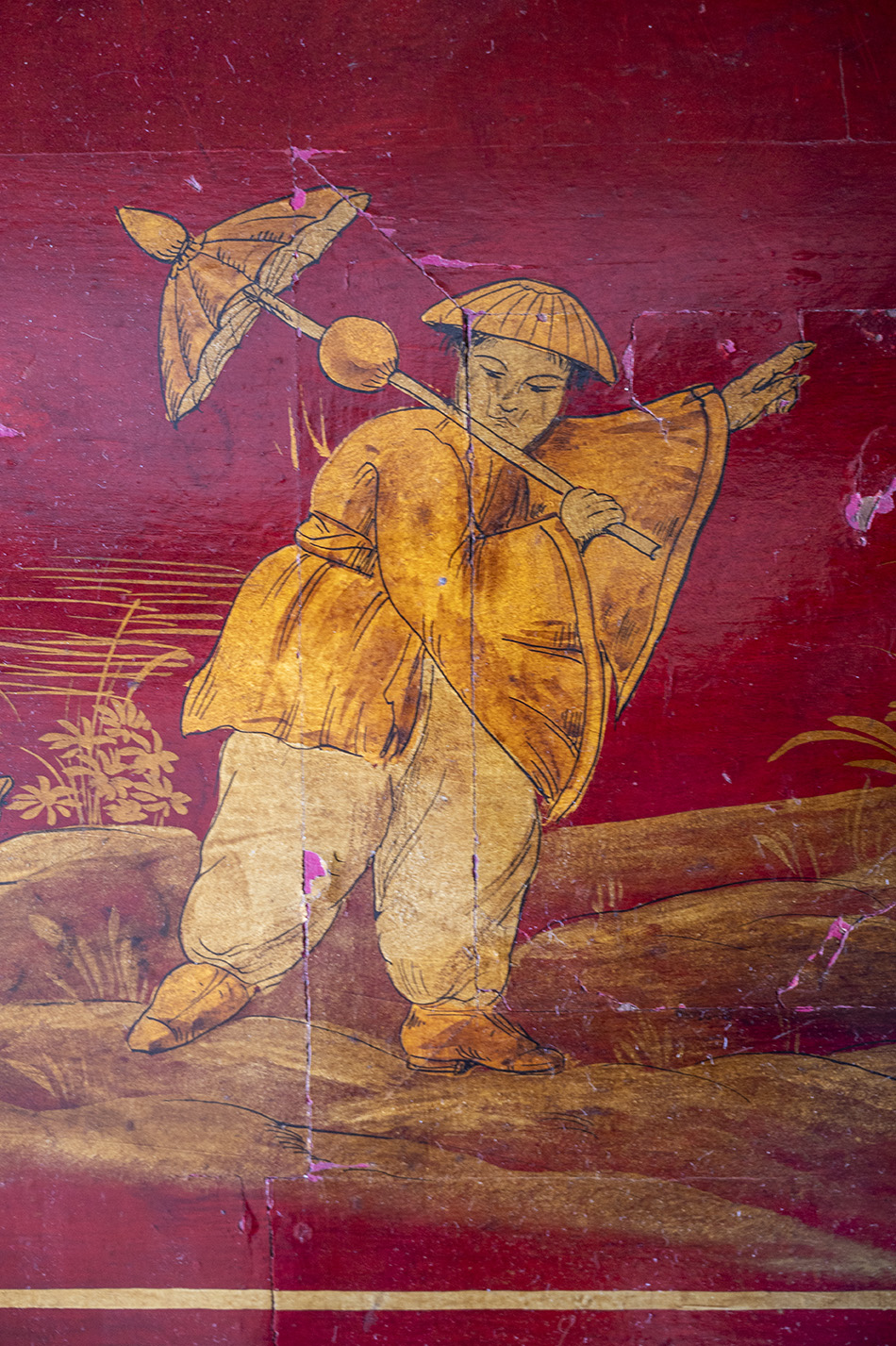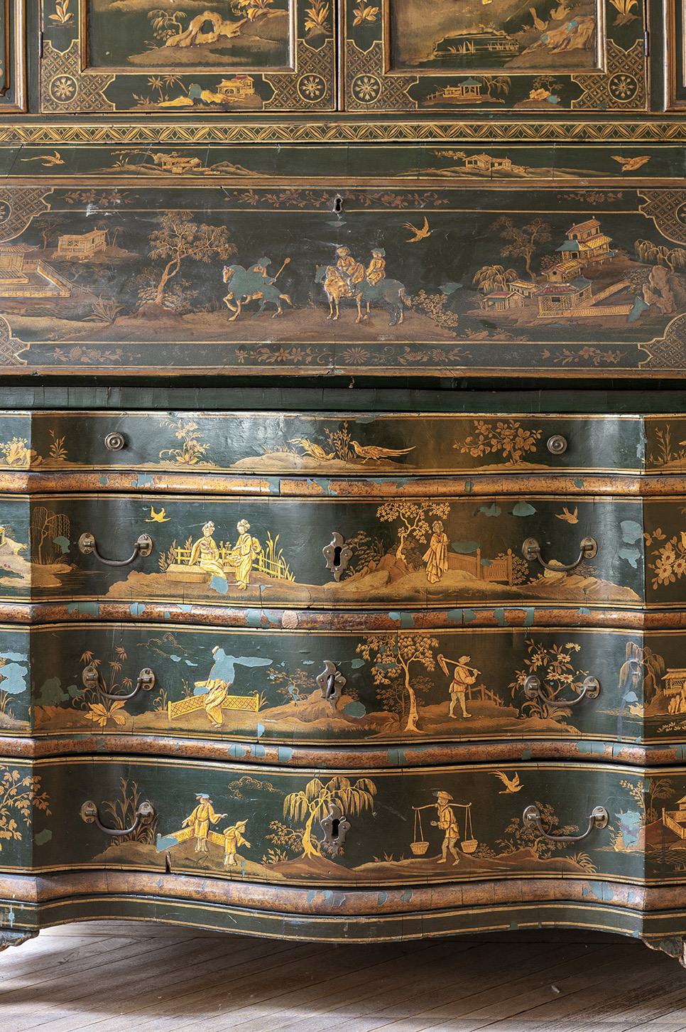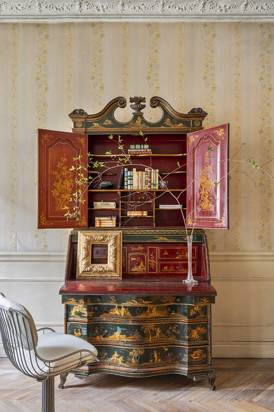 Mueble escritorio estilo chinoiserie del siglo XVIII lacado con incrustaciones pintadas. Sus detallados grabados dorados en un fondo lacado verde evocan paisajes y relatos antiguos.