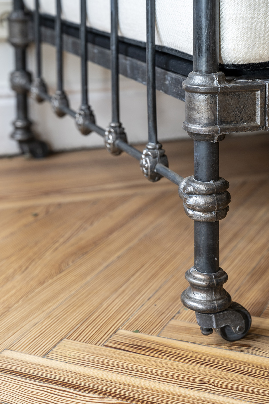 Esta cama de hierro, de diseño clásico, cuenta con elegantes adornos dorados en sus extremos, aportando un toque de sofisticación discreta. Ha sido totalmente restaurada, y lleva colchoneta a medida con una pareja de cojines en forma rulos a conjunto.