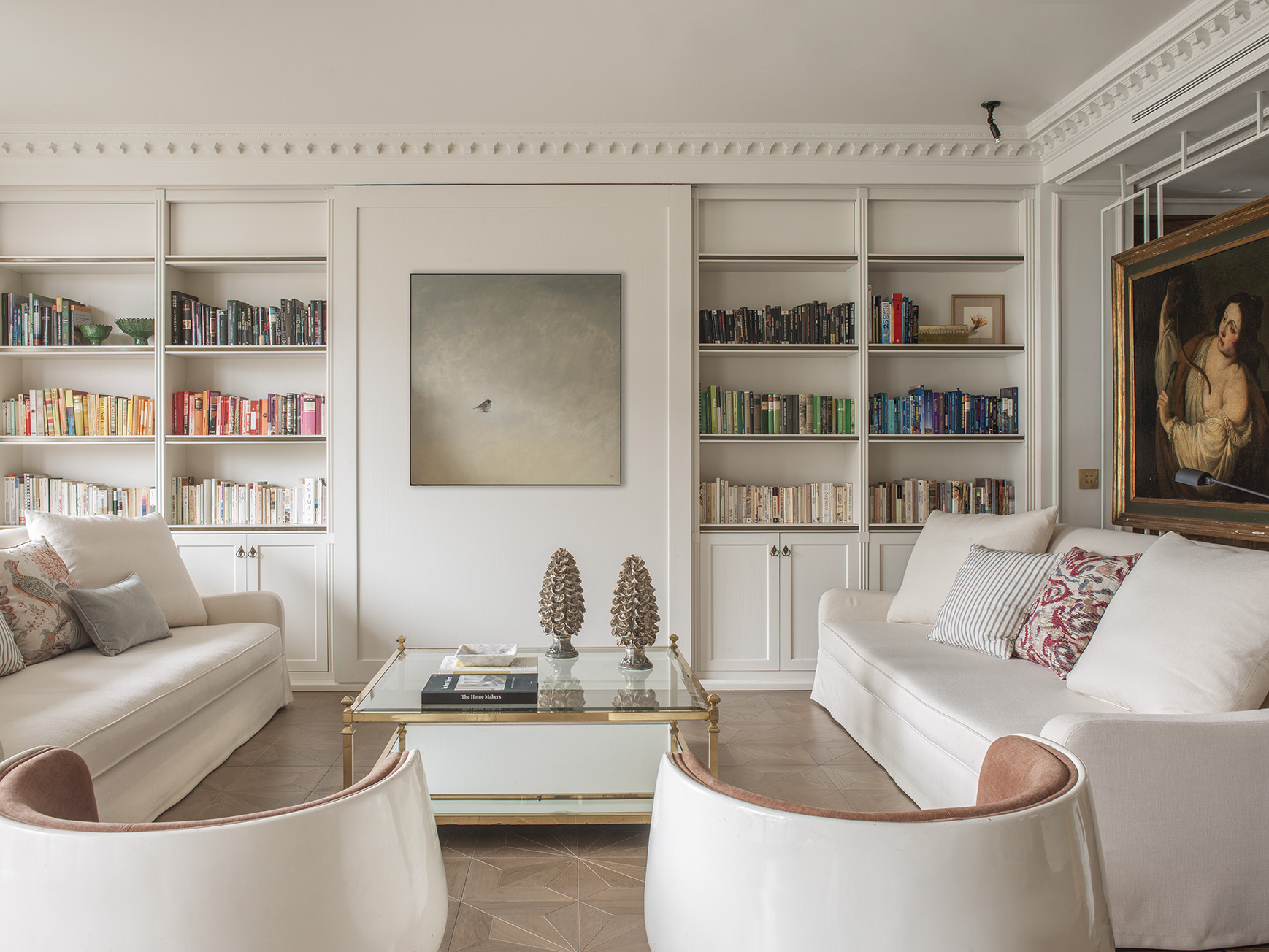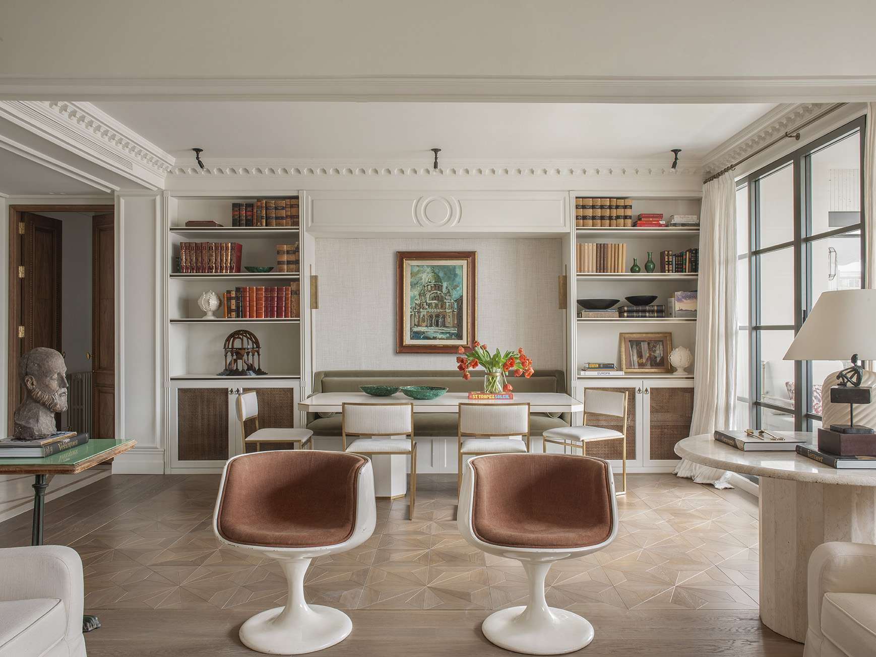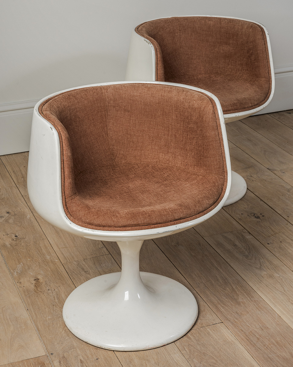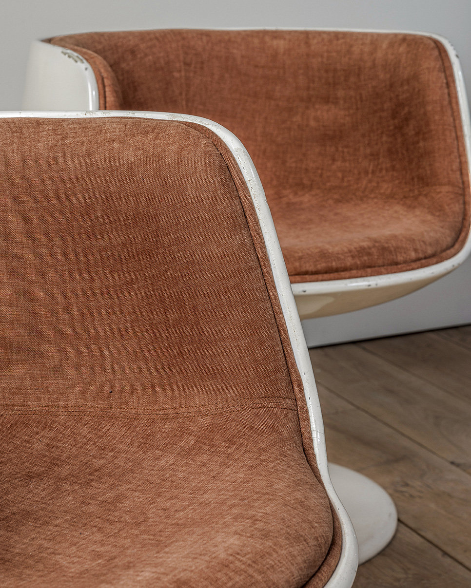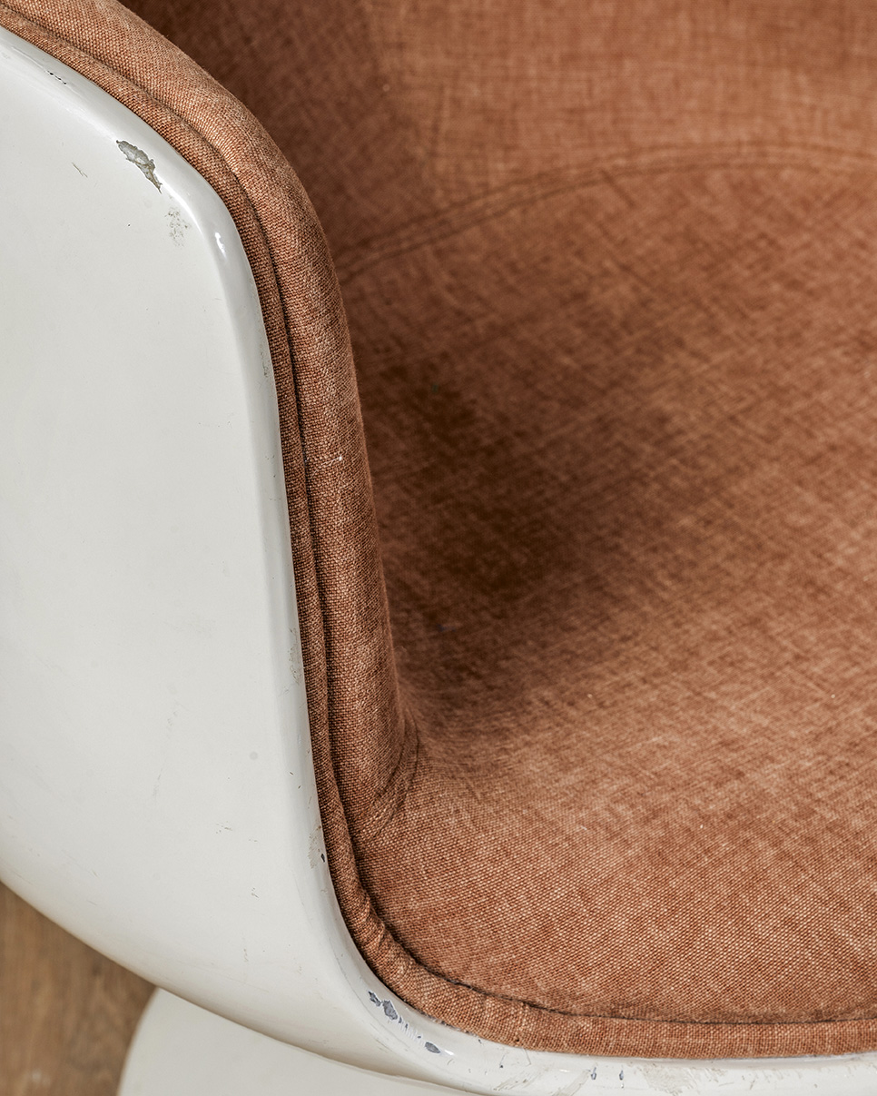 Nos gustan estas butacas porque el brillo desgastado de la fibra de vidrio y sus formas curvas. El color blanco se ha ido oscureciendo hasta coger una pátina muy atractiva, potenciada por las pequeñas faltas que tiene. Son los signos del paso del tiempo sobre ellas lo que las hace especiales.