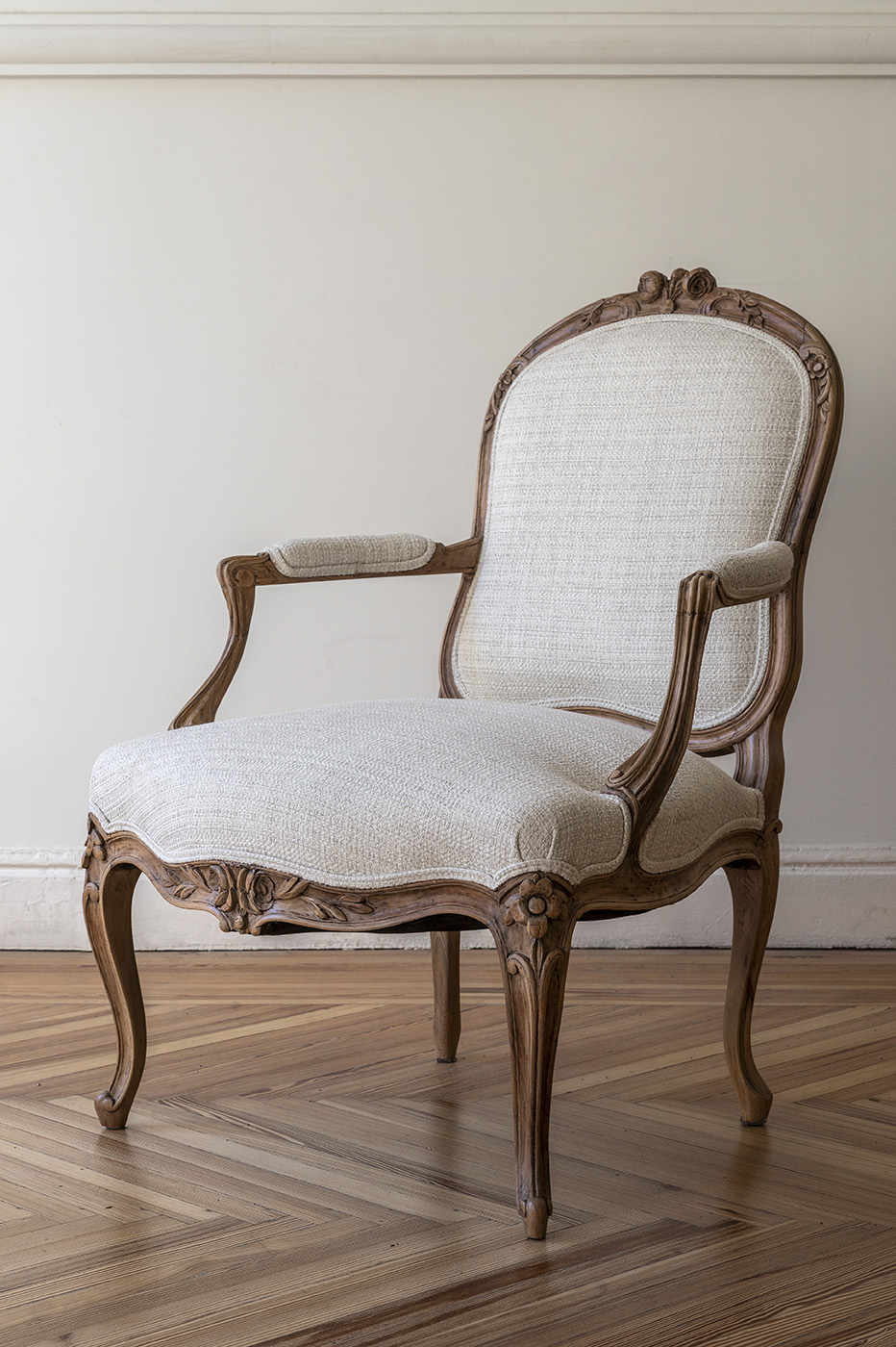 Pareja de butacas francesas, con estructura de nogal y detalles grabados, que reflejan el característico diseño Luis XVI.