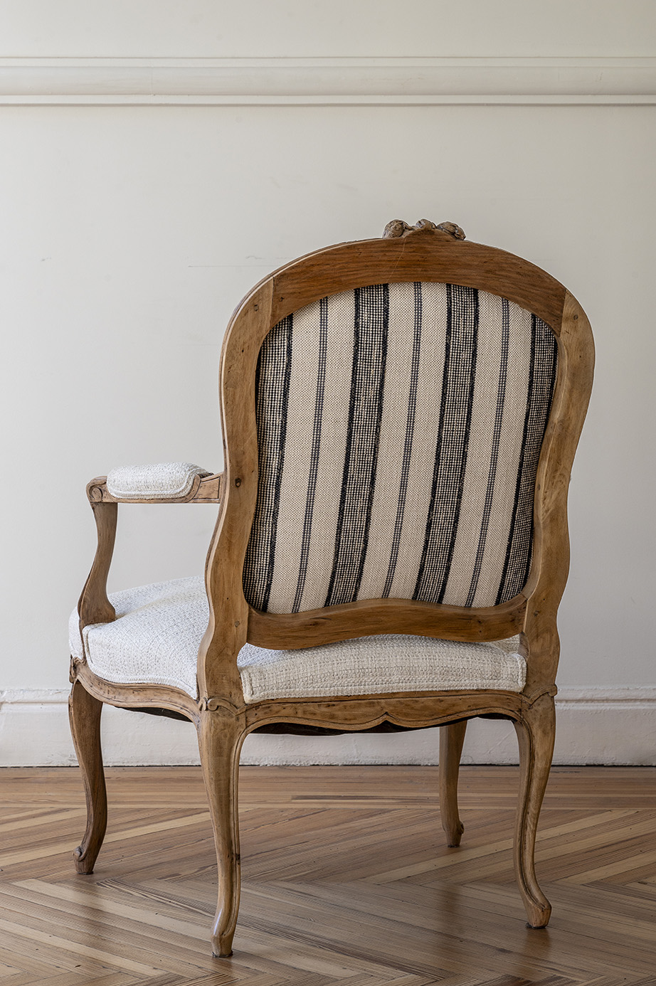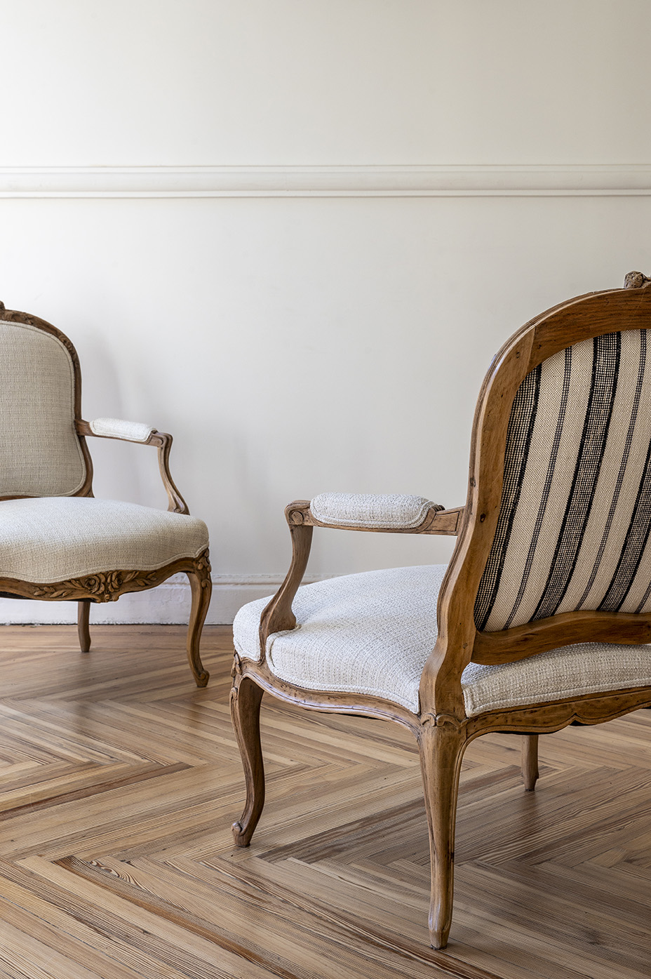 Están completamente restauradas y retapizadas, por delante con una tela con textura clara y por detrás con un lino de rayas.