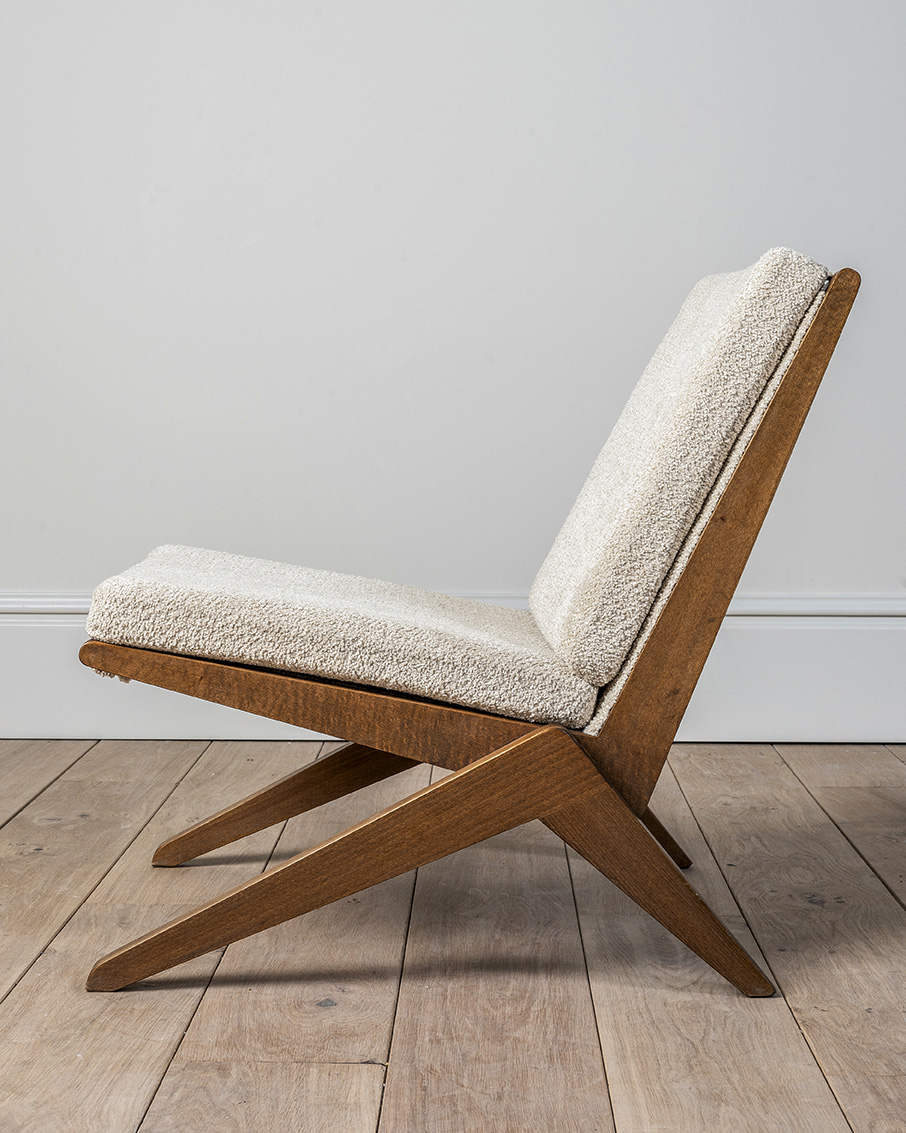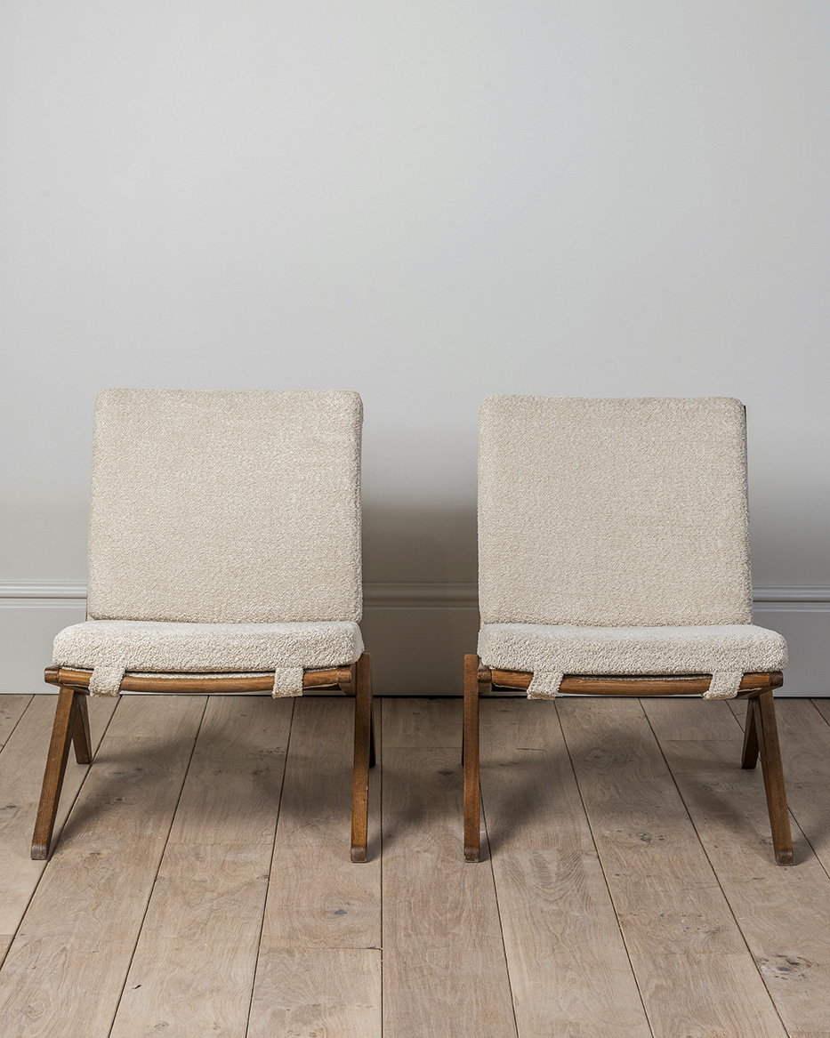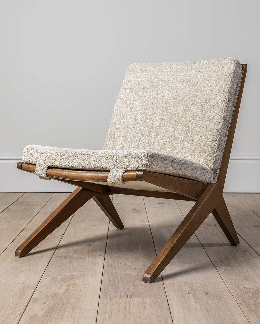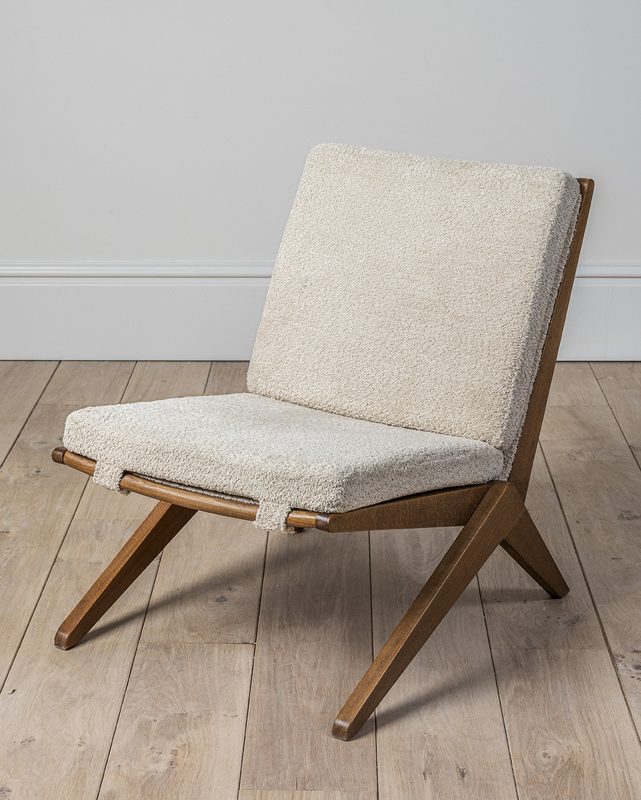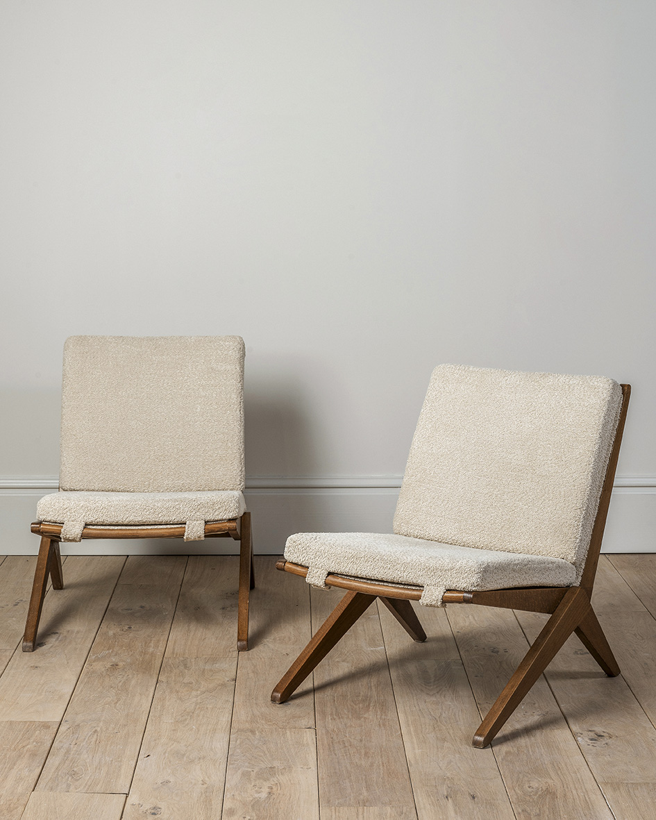 Sillas tipo scissors al estilo de Pierre Jeanneret, ‘Modelo 92’, alrededor de 1950. Estas sillas son conocidas por su diseño, a menudo asociado con la estética del movimiento modernista en el diseño de muebles.