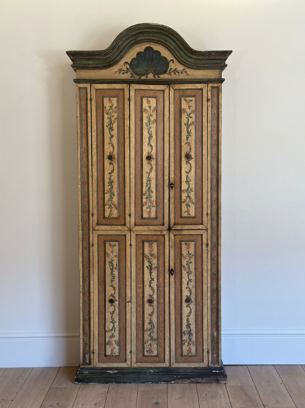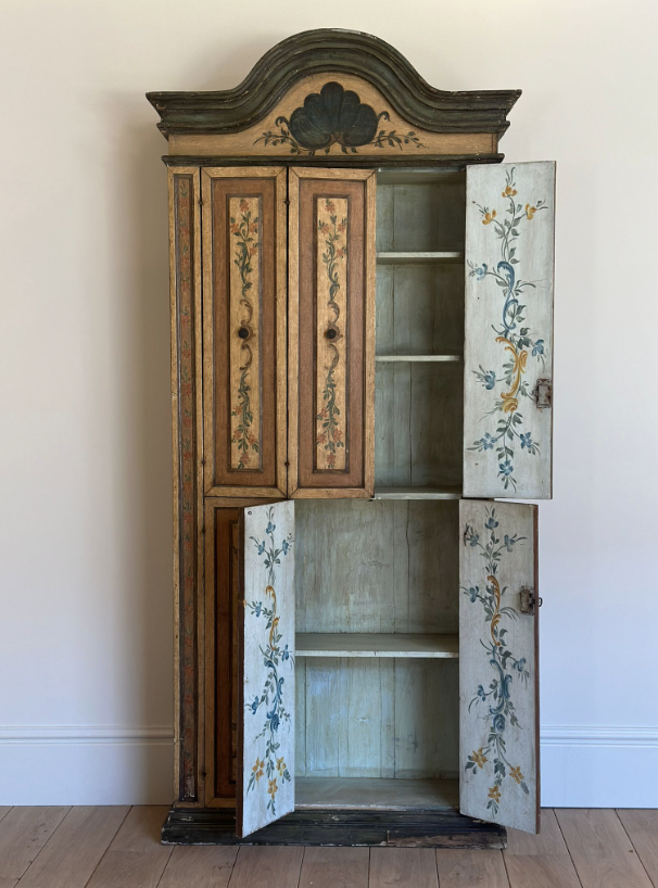Vitrina con puertas acordeón pintadas a mano con motivos floreados.